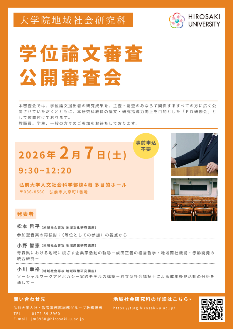 - 2026年度 弘前大学大学院地域社会研究科(後期3年博士課程)第2期 学生募集の実施について 2025.12.11 入試情報