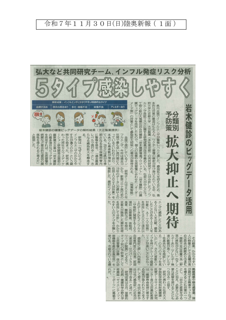 弘前大学、京都大学と大正製薬株式会社(本社:東京)の共同研究チームが分析したインフルエンザ発症リスクに関する研究成果について、2025(令和7)年11月30日(日)付の陸奥新報に掲載されました。