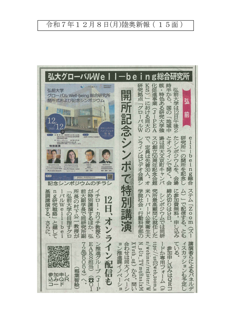 2025(令和7)年12月12日(金)14時半より、弘前大学が「グローバルWell-being総合研究所」の開所を記念したシンポジウムを会場とオンラインのハイブリッドで開催することについて、12月8日(月)付けの陸奥新報に掲載されました。