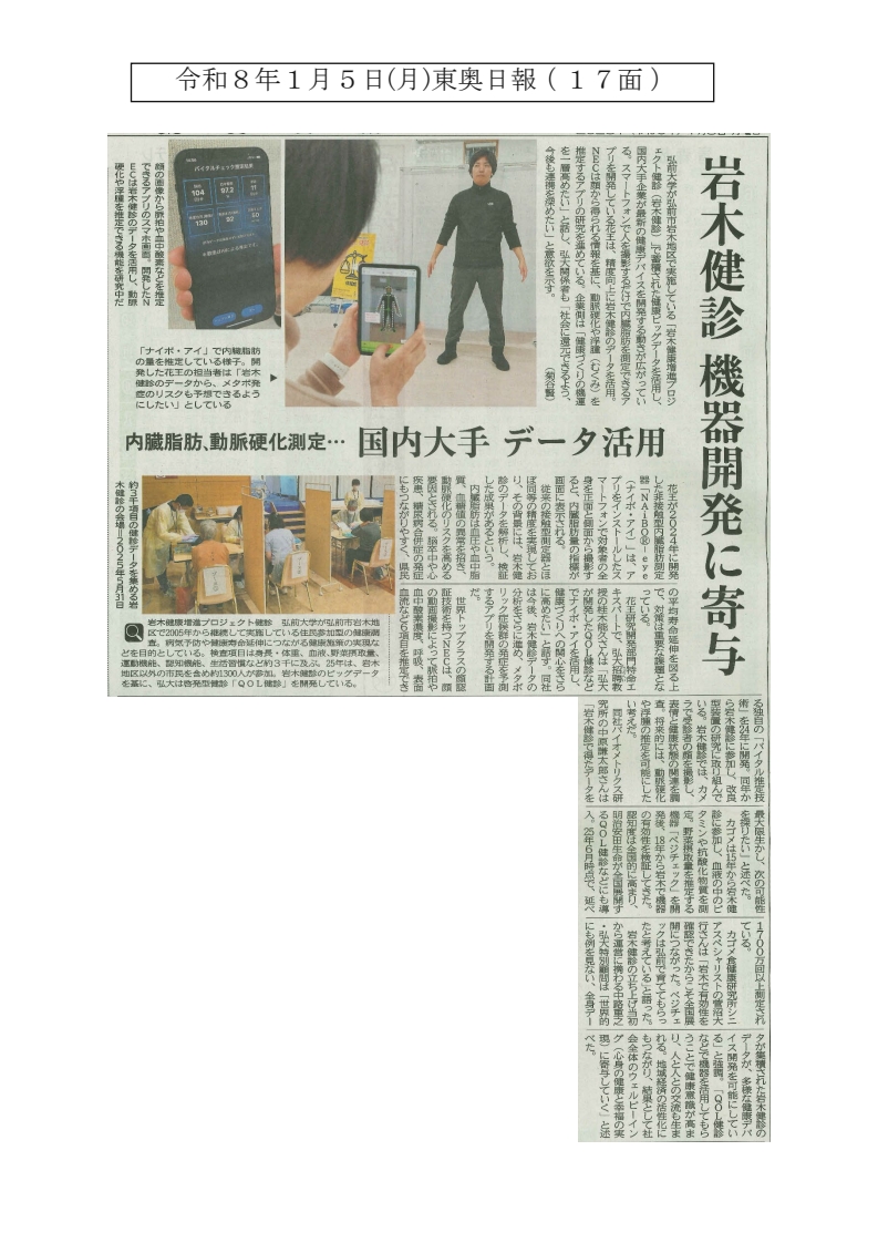 弘前大学が実施している「岩木健康増進プロジェクト健診」のデータが、国内大手企業の最新健康デバイスの開発に活用されていることについて、東奥日報(1月5日(月))に掲載されました。