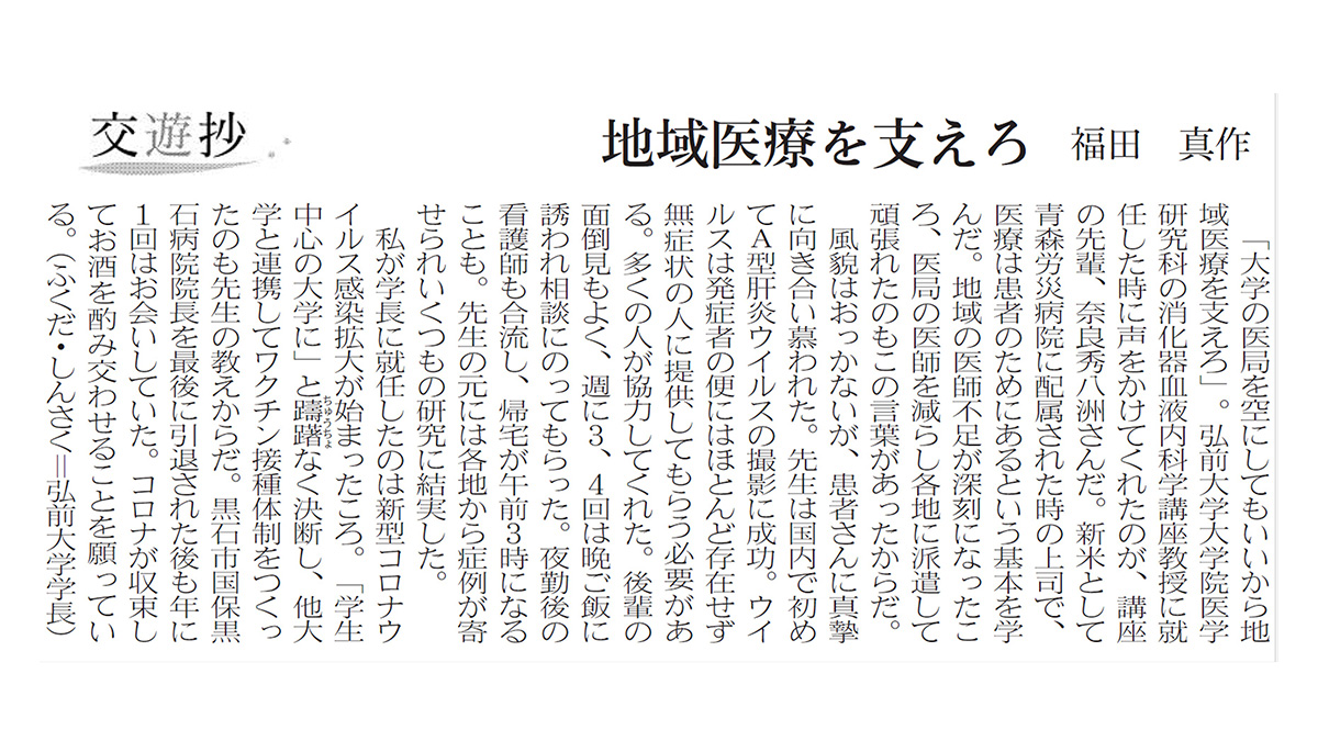 日本経済新聞朝刊「交遊抄」(2022年7月1日掲載)に福田眞作学長が寄稿しました。 「交遊抄」は、親交の深い人物との交友録や随想を紹介するコーナーで、福田学長が元黒石病院院長 奈良秀八州 氏とのエピソードについてご紹介しています。