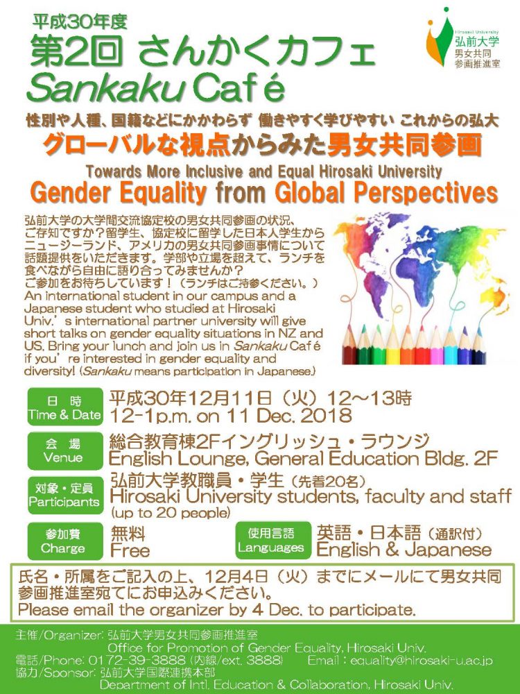 An international student in our campus and a Japanese student who studied at Hirosaki Univ.’s international partner university will give short talks on gender equality situations in NZ and US. Bring your lunch and join us in Sankaku Café if you’re interested in gender equality and diversity! (Sankaku means participation in Japanese.)