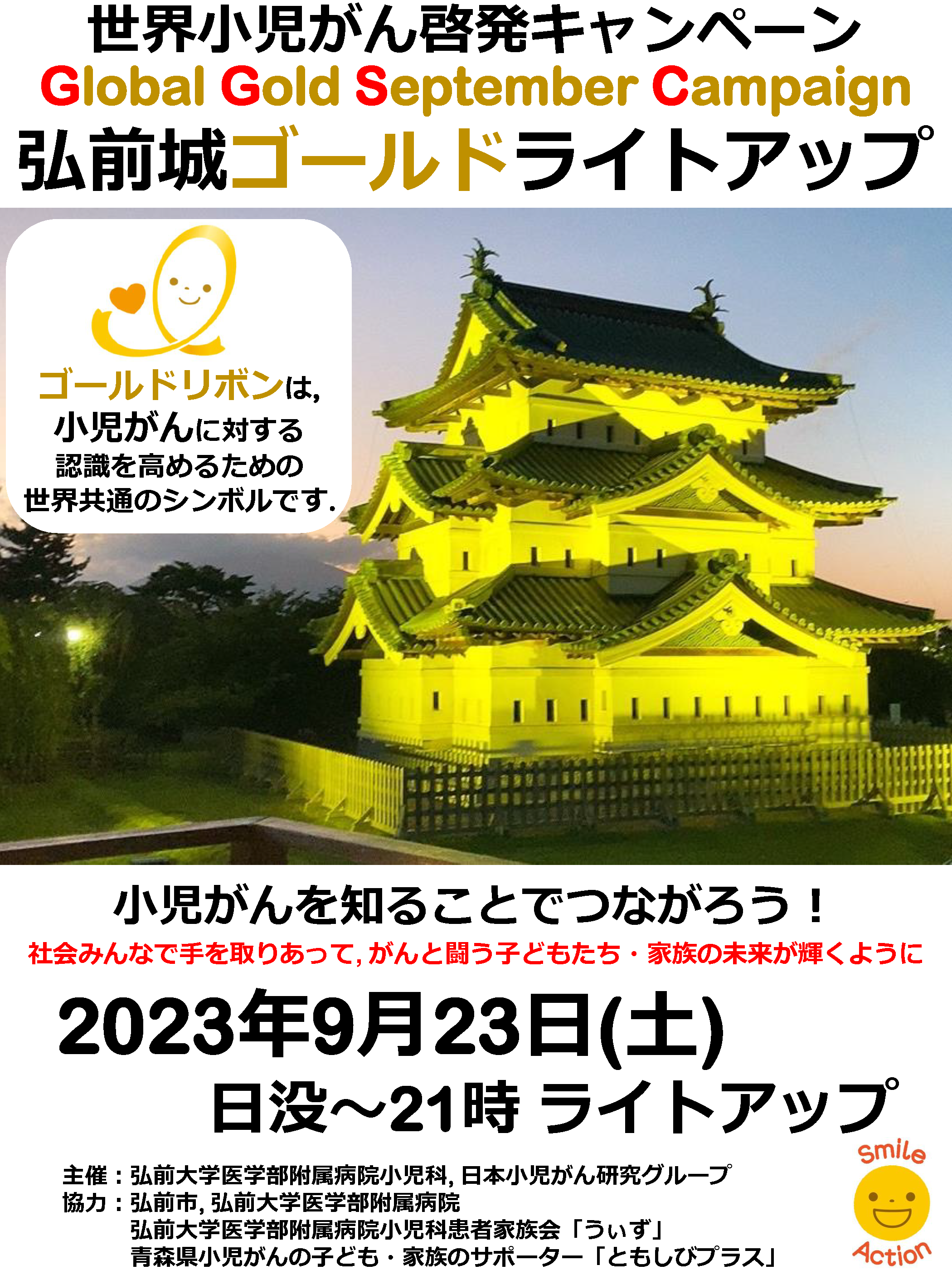 弘前大学医学部附属病院小児科においても、地域の皆さまに小児がんについて知って頂きたい、闘病中やサバイバーの子どもたち、その家族に全国・全世界に仲間がいるということを感じて頂きたいという思いで、弘前市や患者家族会の協力を得て、弘前のシンボルである弘前城天守のライトアップを計画しました。弘前城でのゴールドライトアップは昨年に続き2回目となります。弘前のシンボルである弘前城ライトアップを通して、小児がん支援の輪が広がることを願います。