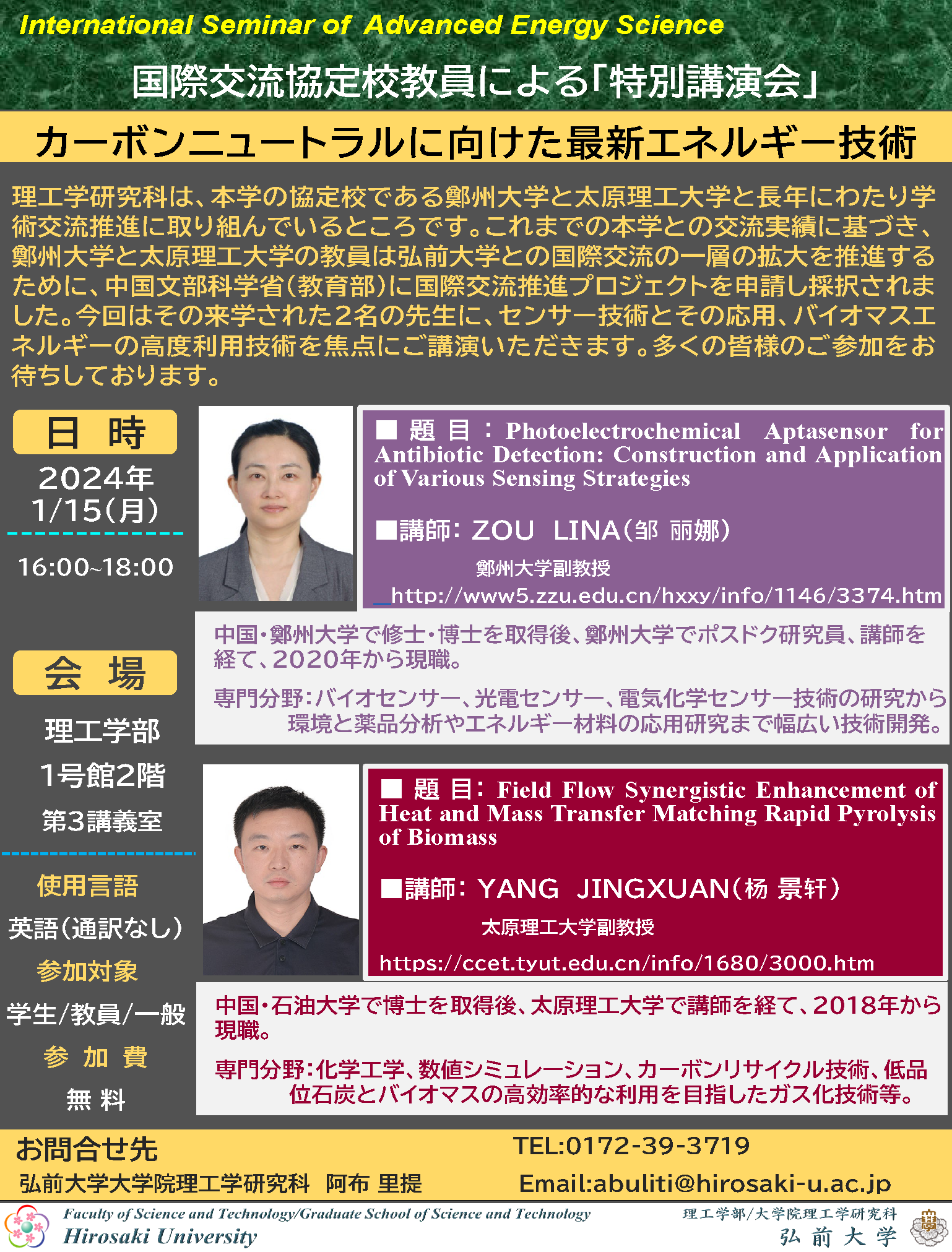 理工学研究科は、本学の協定校である鄭州大学と太原理工大学と長年にわたり学術交流推進に取り組んでいるところです。これまでの本学との交流実績に基づき、鄭州大学と太原理工大学の教員は弘前大学との国際交流の一層の拡大を推進するために、中国文部科学省(教育部)に国際交流推進プロジェクトを申請し採択されました。今回はその来学された2名の先生に、センサー技術とその応用、バイオマスエネルギーの高度利用技術を焦点にご講演いただきます。多くの皆様のご参加をお待ちしております。