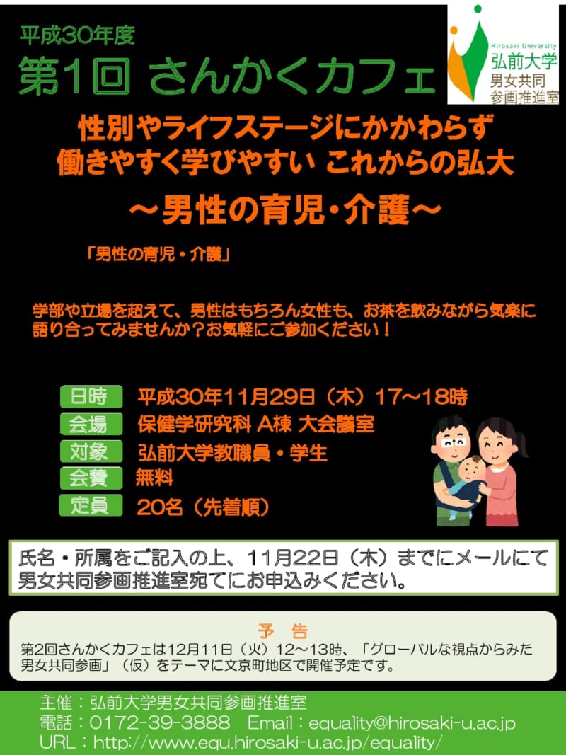 【11月29日】弘前大学男女共同参画推進室 平成30年度 第1回「さんかくカフェ」開催のお知らせ【11月22日申込締切】