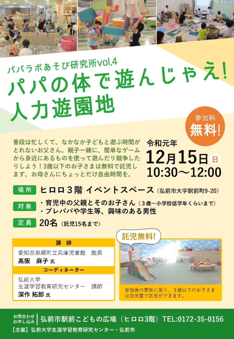 弘前大学生涯学習教育研究センターでは、弘前市と共催で父親を対象とした公開講座を以下のとおり開催します。普段は忙しくて、なかなか子どもと遊ぶ時間がとれないお父さん。親子一緒に、簡単なゲームから身近にあ ...続きを読む
