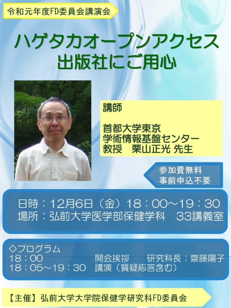 弘前大学大学院保健学研究科では,令和元年度 FD 講演会を下記のとおり開催いたします。事前の申し込みは不要ですので,参加を希望される方は,当日直接会場にお越しください。 多数のご参加をお待ちしてお ...続きを読む
