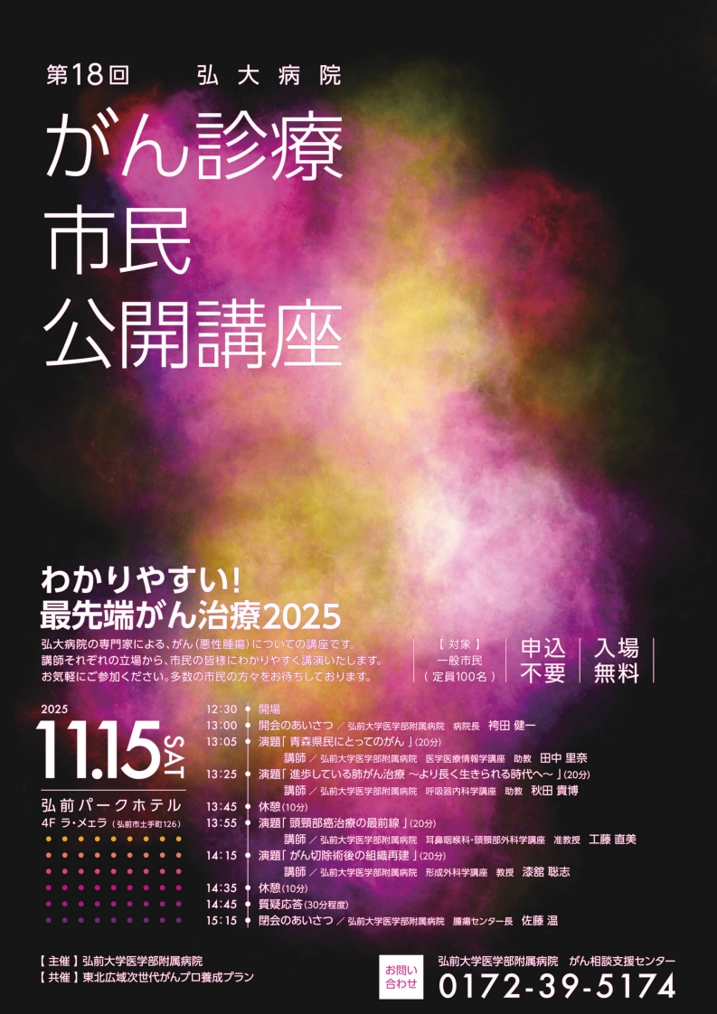 2025.11.14第18回弘大病院がん診療市民公開講座開催について 弘前大学医学部附属病院のがん診療を広く市民の皆様に知っていただくことを目的に開催し、がんについて専門家がそれぞれの立場からわかりやすく講演します。 ...続きを読む