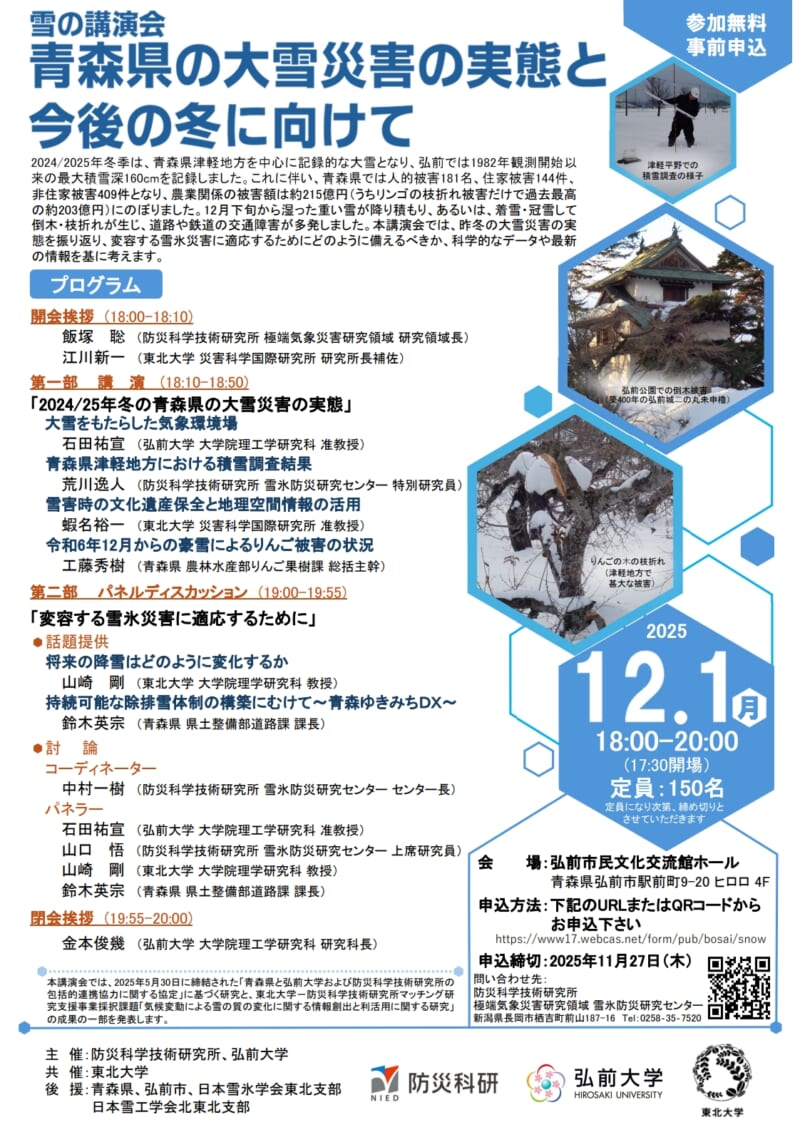 2025.11.14雪の講演会「青森県の大雪災害の実態と今後の冬に向けて」開催のお知らせ 本講演会では、記録的な大雪となった昨冬を振り返り、変容する雪氷災害に適応するためにどのように備えるべきかを、科学的なデータや ...続きを読む