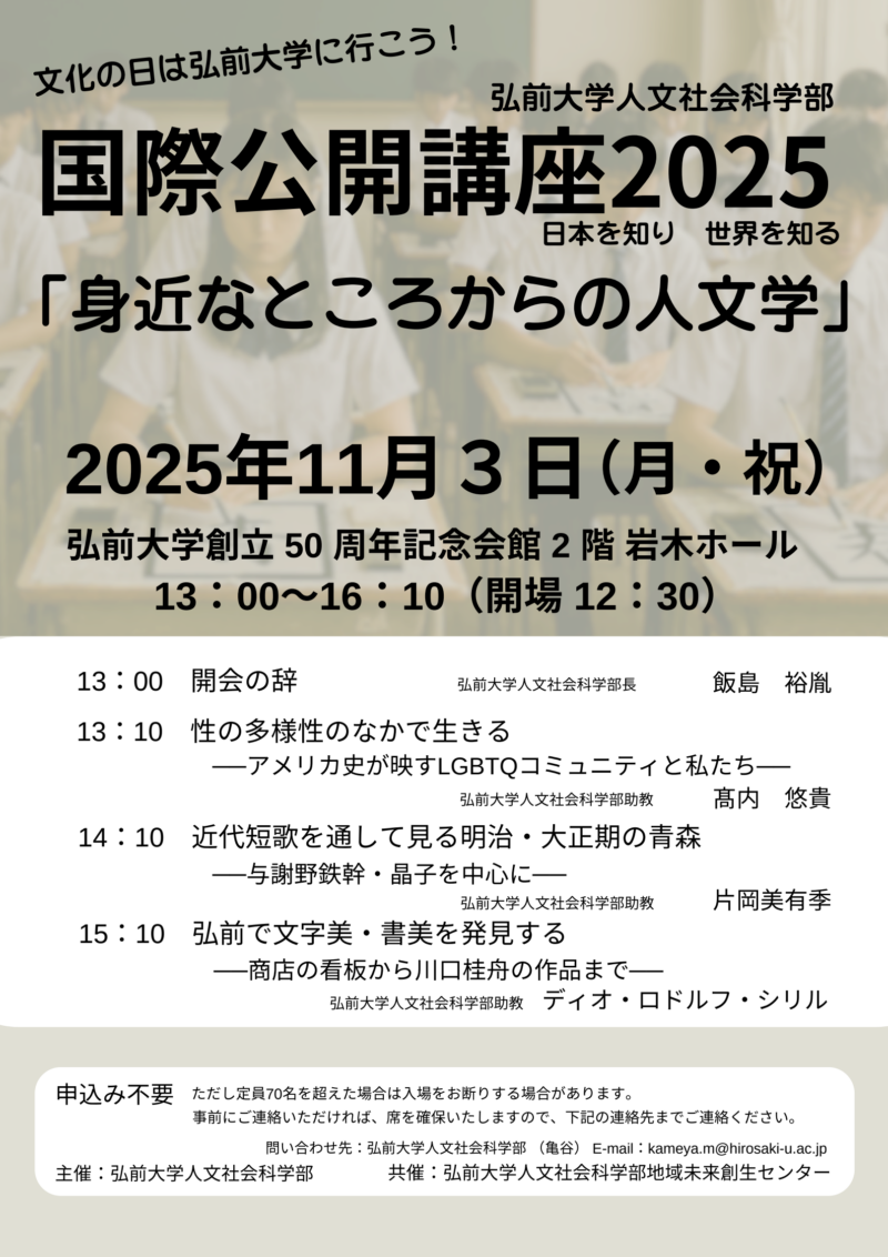 第24回弘前大学総合文化祭 2025(令和7)年10月17日(金)午後~19日(日)の3日間、第24回弘前大学総合文化祭を開催します。 今年度も、昨年度と同様に一般の方々の入場も含めた全面対面での ...続きを読む