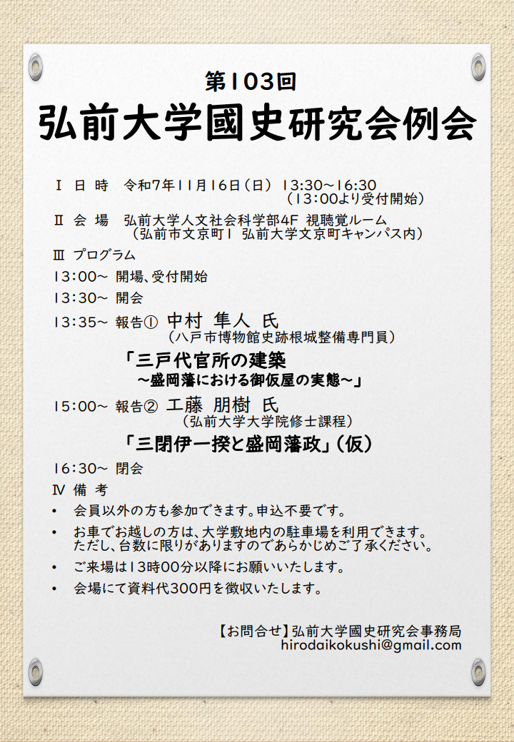 【弘前大学國史研究会】第103回例会のご案内 弘前大学國史研究会では、下記のとおり例会を開催いたしますので、是非ご出席ください。 イベント詳細 日時 2025(令和7)年11月16日 ...続きを読む