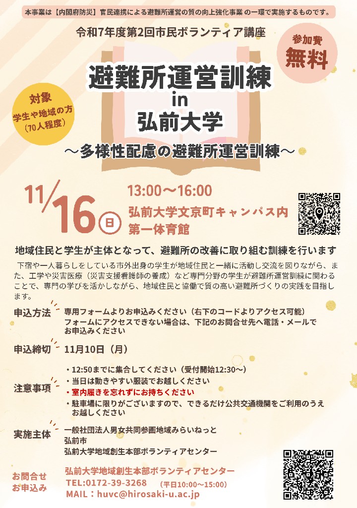 「避難所運営訓練in弘前大学」開催のお知らせ 弘前大学ボランティアセンターでは、一般社団法人男女共同参画地域みらいねっとと共催で「避難所運営訓練in弘前大学」を開催いたします。 地域住民と学生 ...続きを読む