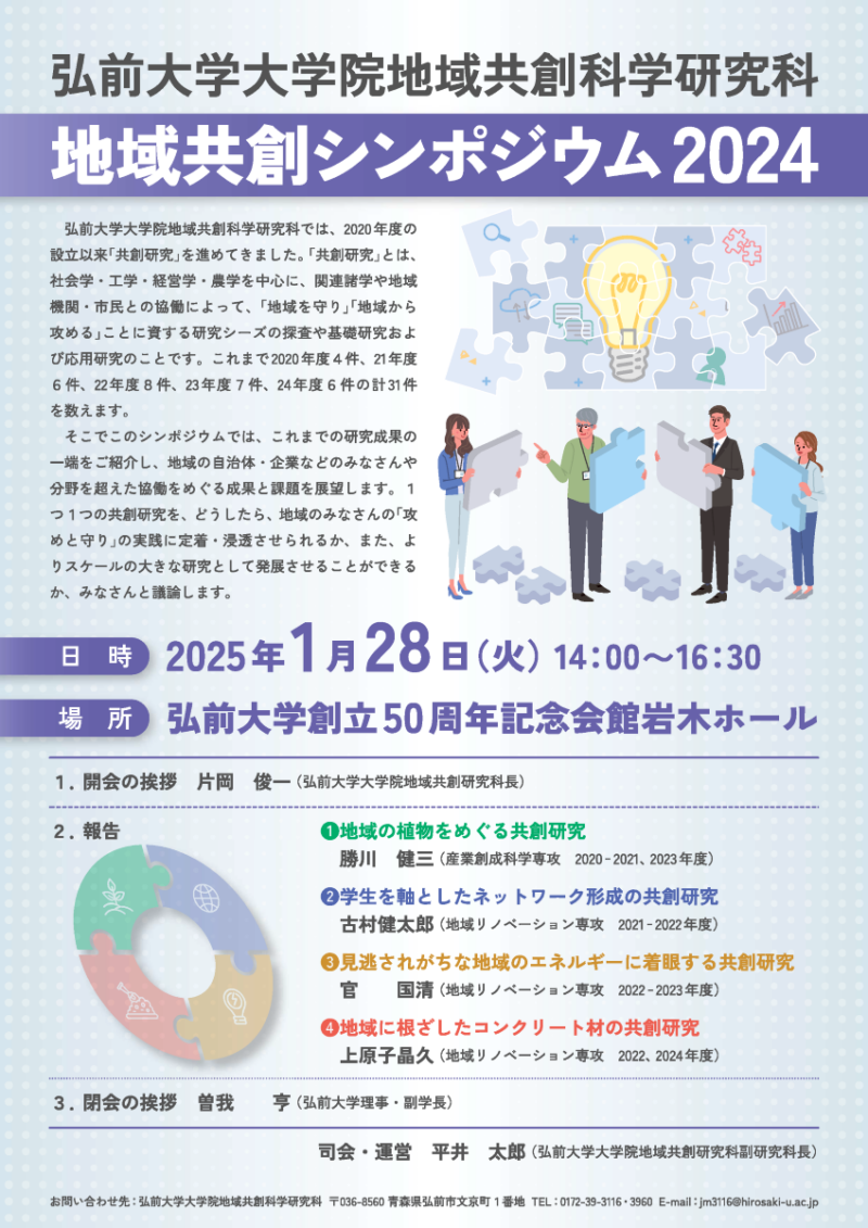 理工学研究科博士後期課程安全システム工学専攻の博士論文公聴会の開催のお知らせ 弘前大学大学院理工学研究科博士後期課程安全システム工学専攻の博士論文公聴会を下記の要項で開催いたします。 皆様のご出席 ...続きを読む