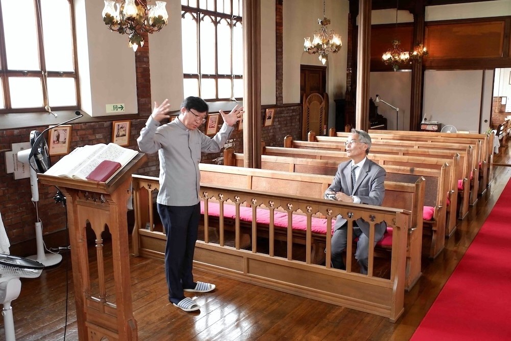 学外では、弘前昇天教会を訪問されました。この教会は、弘前市の歴史的建造物として知られており、弘前大学のイメージポスターにも登場しています。設計者は、立教大学校長を務めたジェームズ・ガーディナー先生で、立教大学を設置する立教学院と弘前昇天教会は、それぞれ日本聖公会に連なる教育機関と教会として長い歴史があります。イギリス積の赤レンガが印象的で、ゴシック様式の建築でまとめたこの教会は、多くの来訪者に感銘を与えています。