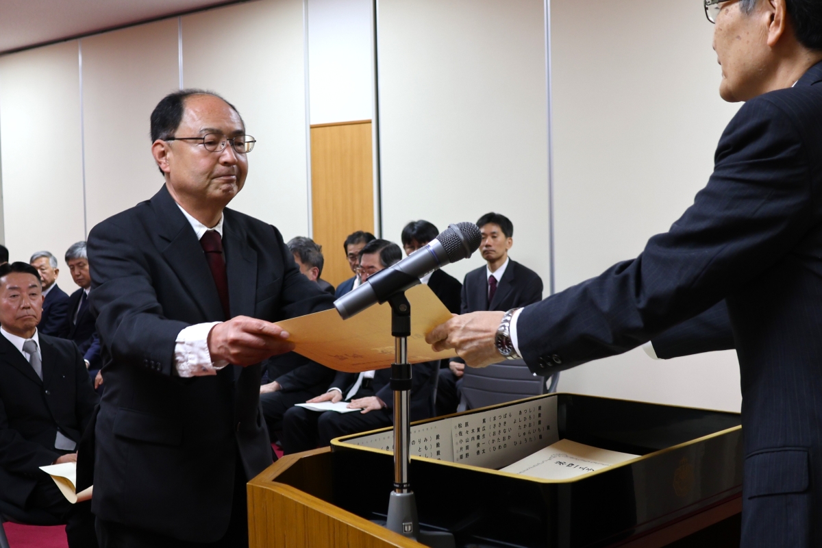 名誉教授称号授与式は、6月2日(月)午前11時30分から弘前大学創立50周年記念会館岩木ホールにおいて執り行われ、福田学長から一人ひとりに辞令書が交付されました。また、授与式終了後、懇談会が開かれました。