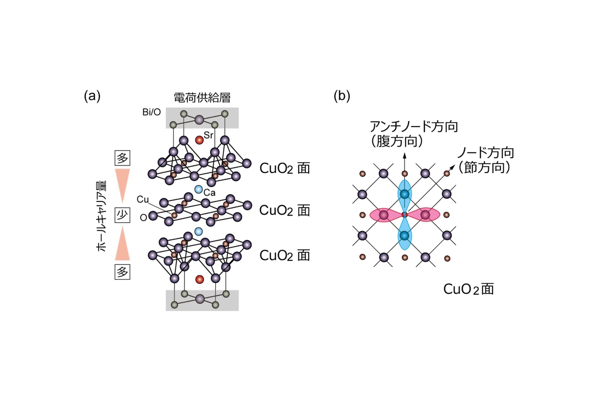 銅酸化物高温超伝導体は、電荷供給層からCuO2面にキャリアが供給されることで超伝導が発現します(図1(a))。三層系銅酸化物では1単位格子に3枚のCuO2面があり、外側の2枚には多くのキャリアが入り、内側の1枚には少量しか注入されません。この内側CuO2面は、外側2枚に挟まれて「保護」されるため、平坦で清浄な状態が保たれ、超伝導に理想的な環境をもつと考えられます。