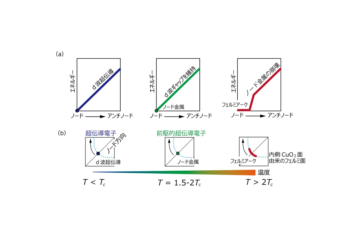 さらに温度を上げても、Tcの約1.5~2倍に至る高温領域までd波の節構造を保持した「ノード金属」状態と呼ばれる特殊な状態が続くことを世界で初めて観測しました(図2)。この結果は、Tcを大きく超える温度から内側CuO2面で超伝導電子が形成され始めていることを意味しています。また、外側CuO2面からの「近接効果」が内側CuO2面の超伝導を安定化させ、d波超伝導を維持していることを見出しました。