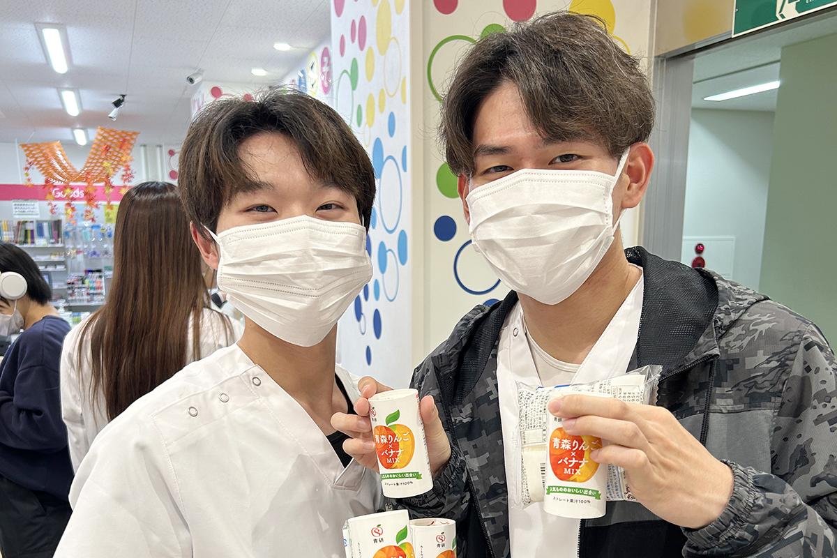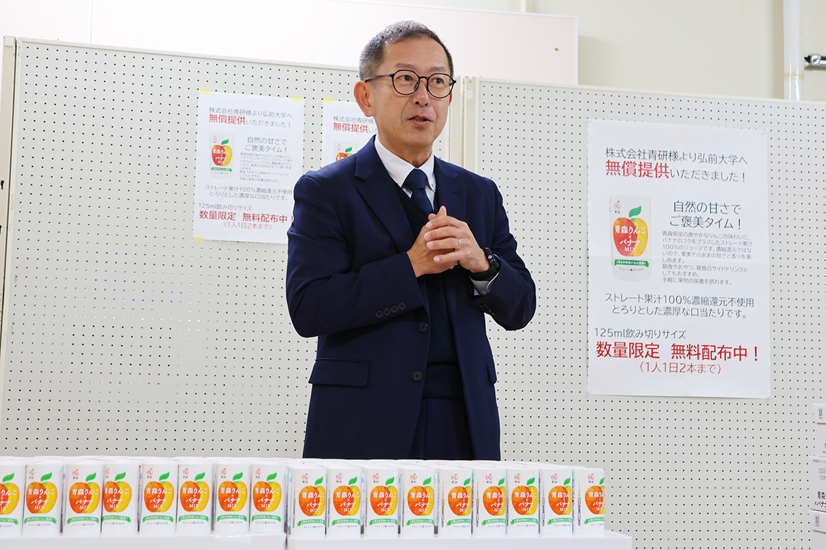 2025(令和7)年11月11日(火)、弘前大学の文京町キャンパス(文京食堂ホレスト)と本町キャンパス(フェリオ、クローバー)で、学生支援の一環としてりんごジュース7,200本を無料配布しました。