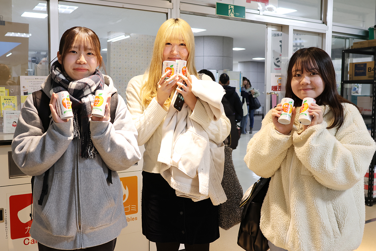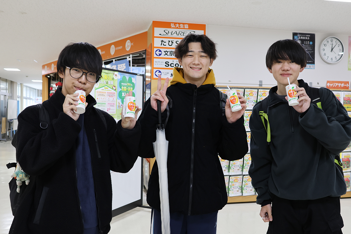 当日は、りんごジュースを無償で提供いただいた株式会社青研 代表取締役社長の奥田 邦雄様、そして福田学長をはじめとする本学職員が、学生一人ひとりに手渡しました。物価高騰の影響で手に取りにくくなったりんごジュースに、学生たちは驚きながらも笑顔で受け取っていました。