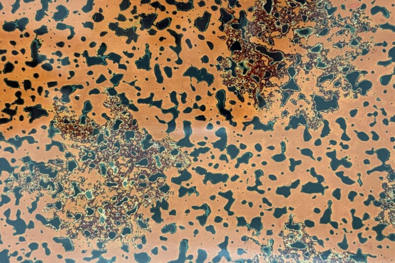 今回発見された盆は、長野県の古物商がインターネット・オークションに出品していたもので、共箱の蓋裏には2つの角印が確認されます。そのうち1つは「弘前市百石町」と判読でき、齋藤漆器店の所在地と一致します。本体は、1920〜1930年代に中央で流行した幾何学的意匠―アール・デコや構成主義の影響をうかがわせるデザインを採用し、把手の内側にまで唐塗が施されるなど、非常に精緻なつくりとなっています。