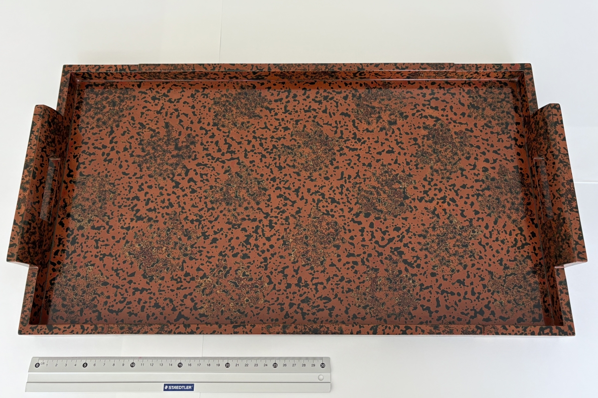 これらの特徴から、この盆は第22回商工省工芸展覧会に出品された「珈琲盆」と同手の作品である可能性が高く、これまで具体的な年代を特定できる作例がほとんど知られていなかった1930年代の津軽塗の実像を明確に示す、極めて貴重な資料です。
