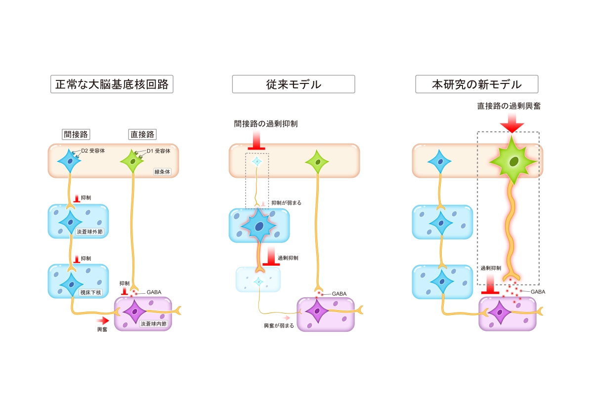 - 従来、この副作用は、大脳基底核における神経回路のうち「間接路3」とよばれる経路の異常によって説明されてきましたが、本研究は、「直接路4」と呼ばれる別の回路を構成する神経細胞に構造的変化が生じることを初めて明らかにしました。