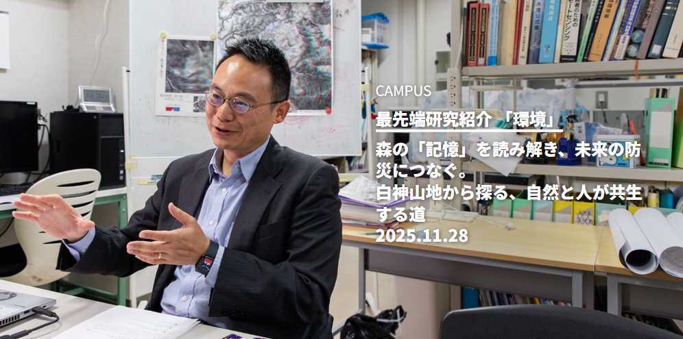 世界自然遺産・白神山地。その豊かな森は、景観として美しいだけでなく、過去の災害の「記憶」も刻んでいます。鄒 青穎先生は、地すべりや土砂災害のメカニズムを研究する砂防学を専攻。樹木の年輪や最新技術を駆使し、自然が発するメッセージを読み解く研究に取り組んでおり、その成果は地域の防災・環境保全から観光振興まで幅広い分野に及びます。