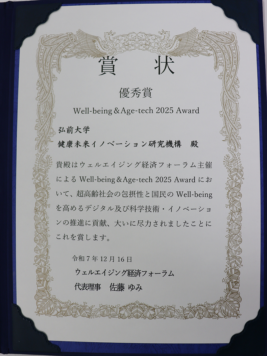弘前大学健康未来イノベーション研究機構は「Well-being&Age-tech 2025 Award」で優秀賞を受賞しました。表彰式は2025(令和7)年12月16日(火)に虎ノ門ヒルズフォーラムで開催され、弘前大学副学長(Well-being戦略担当)・教授 / 健康未来イノベーション研究機構長 村下公一先生が表彰状を授与されました。