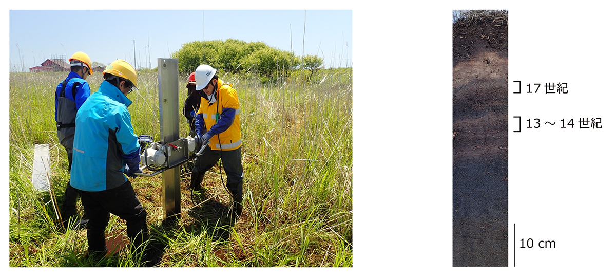 図1:津波堆積物の調査風景(釧路市馬主来)(左)と採取された柱状堆積物試料(右)