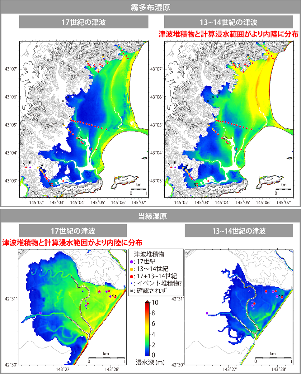 図3:17世紀の津波と13~14世紀の津波による、津波堆積物の分布範囲と津波の計算浸水範囲の比較。根室沖に面した霧多布湿原(上)と十勝沖に面した当縁湿原(下)。津波堆積物の情報は本研究と先行研究※3、※4、※5より確認されたものを図示。