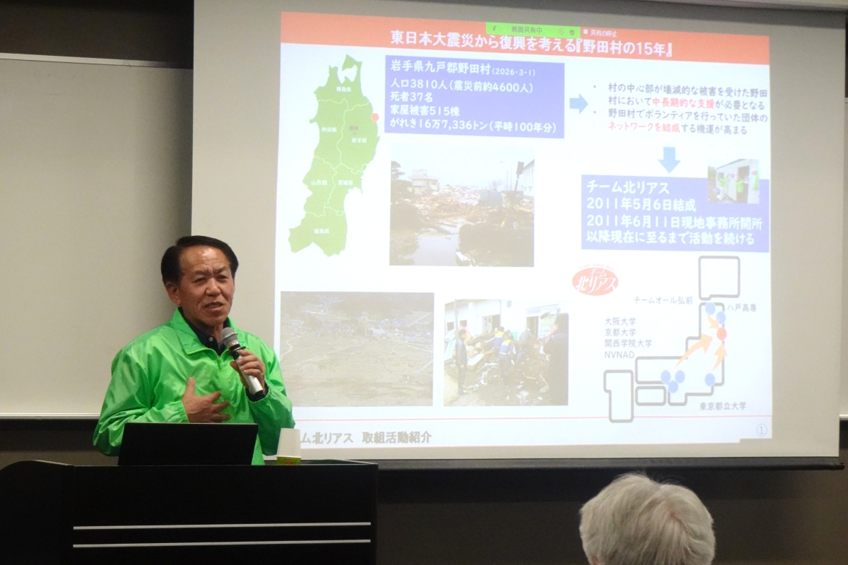 前半は、チーム北リアス(野田村)現地事務所長 貫牛 利一 氏から、「東日本大震災からの歩み・15年」と題したご講演がありました。ご講演では、東日本大震災で甚大な被害を受けた岩手県・北リアス地域(特に野田村)の復興を長期的に支援するために立ち上げられたボランティアネットワークであるチーム北リアス結成の経緯、15年間で行ってきた活動内容について説明がありました。貫牛氏からは、活動を通して生まれたつながりを今後も大切にしたいとのご発言がありました。併せて、ボランティアセンター長の李 永俊から、本学ボランティアセンターが行ってきた活動について説明を行いました。