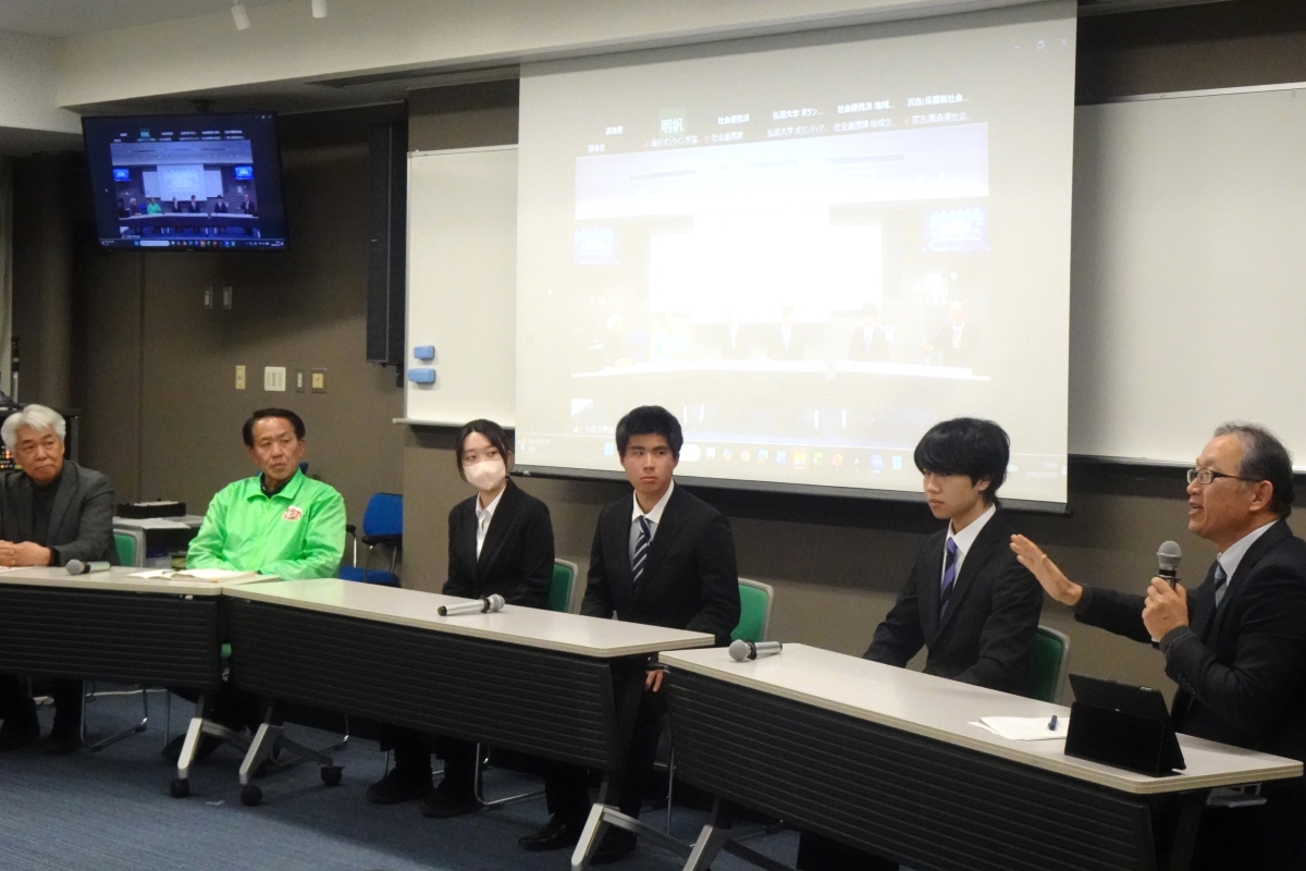 後半は、当センターの学生ボランティアである人文社会科学部2年 清水 遥仁 さん、人文社会科学部2年 原田 秀憲 さん、人文社会科学部1年 小林 幸愛 さんから今年度の活動報告があり、野田村支援交流活動や学習支援事業、サイバー防犯ボランティアについて学生自身が感じたことなどが述べられた後、李センター長と貫牛氏、八戸工業高等専門学校嘱託教授 河村 信治 氏、学生3名で意見交換が行われ、災害支援ボランティアのモチベーションや、ボランティア活動の今後の展望などについて様々な意見が出されました。最後に当センターのボランティアポイント制度でポイントを一定数獲得した学生の表彰が行われ、本報告会は終了しました。