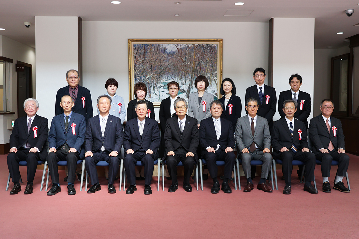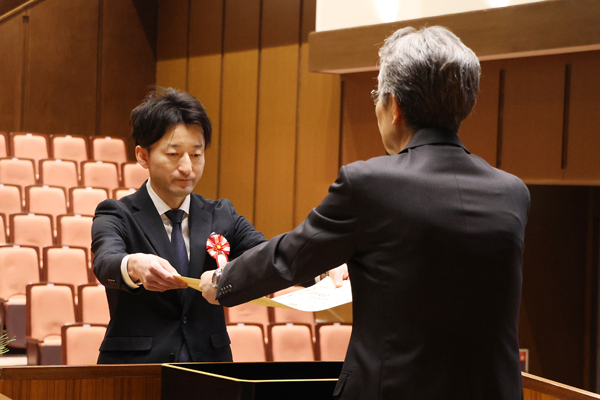 式典では、福田 眞作学長から退職表彰者並びに在職(20年)表彰者に対し、永年にわたり職務に精励されたその功績が称えられ、表彰状及び記念品が授与されました。