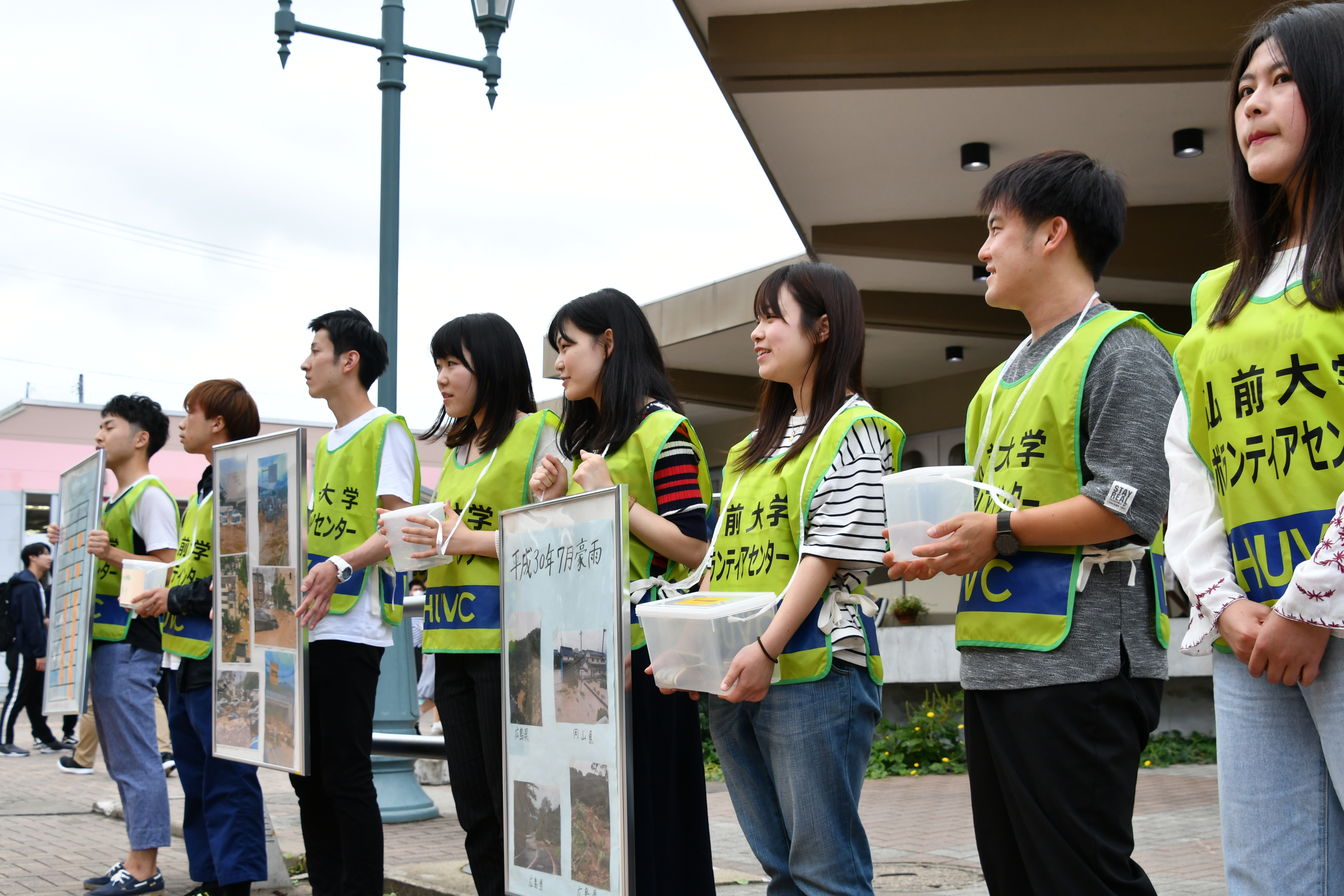 7月11日、弘前大学文京町キャンパスにおいて、学生事務局を中心に募金活動が始まりました。活動初日となる今日は、学生事務局、学生ボランティア、留学生の計10名が、学生や教職員に募金を呼びかけました。同時に、弘前大学大学会館2階にあるボランティアセンターへ募金箱を設置し、今後、ボランティアセンター事業開催時にも募金協力の呼びかけを行う予定です。