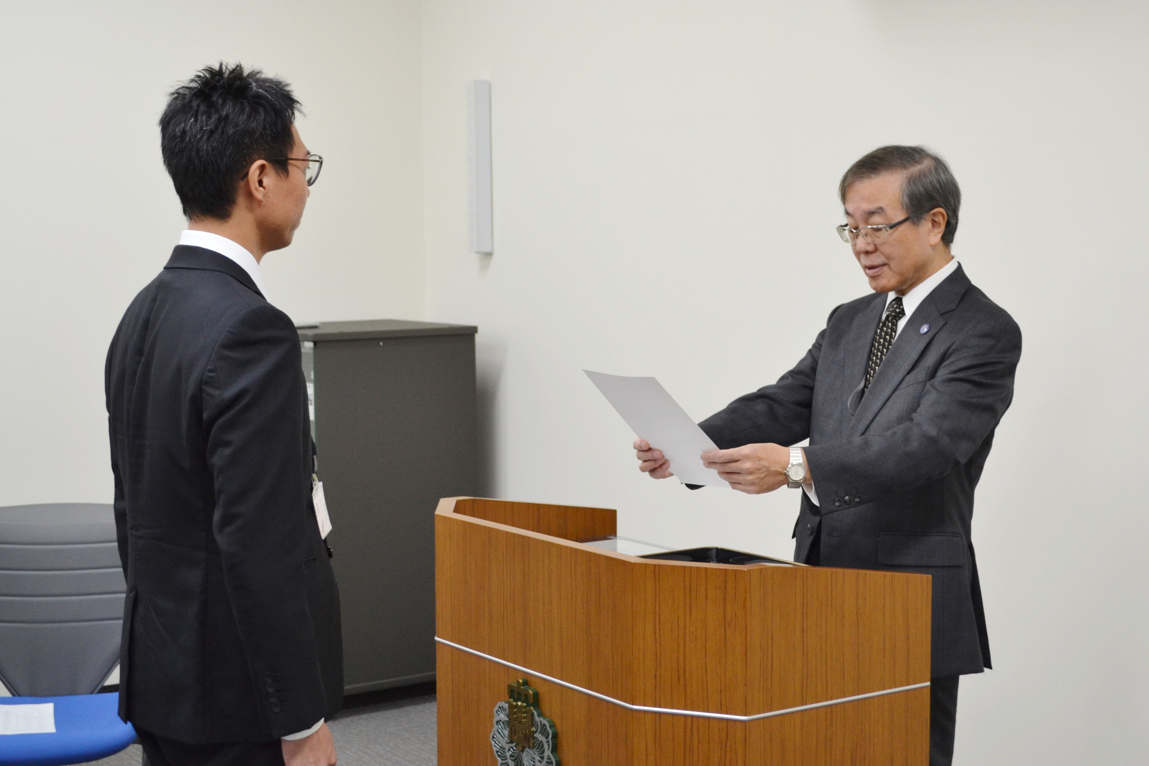 本受入式では,佐藤学長をはじめ,石川理事(社会連携担当)・副学長,齊藤社会連携部長,森副理事,佐藤准教授,地域創生推進室兼任担当教員,連携推進員として,下山千嘉氏(弘前市),丹代陽子氏(平川市),澤田亮太氏(鰺ヶ沢町),黄金崎竜太氏(深浦町),三上学氏(西目屋村),久保田育子氏(藤崎町),藤川啓氏(青森銀行),髙瀬亮輔氏(みちのく銀行),五十嵐真二氏(青い森信用金庫),大石久寿氏(青森県信用組合)が出席し,関係自治体等の副市長,副町長,役員及び部課長等が参列しました。