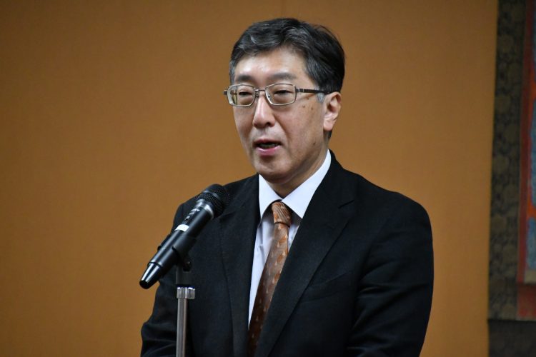 開会にあたり、坂本深浦町教育長から、次に円覚寺副住職の海浦誠観氏、更に今井弘前大学人文社会学部長からご挨拶いただきました。その後、真言宗津軽仏教会による御法楽(実演)が行われ、講演1として弘前大学教職大学院の瀧本壽史教授より『近世津軽と深浦』と題したご講演、講演2として弘前大学人文社会科学部の渡辺麻里子教授より『深浦円覚寺所蔵古典籍の意義-津軽の寺院における「知のネットワーク」-』と題したご講演をいただきました。続いて、特別講演として名古屋大学高等研究院の阿部泰郎教授より『地方寺院資料が照らし出す中世宗教の世界像-聖教調査とアーカイヴス化の意義とは何か-』と題して、地方寺院資料の重要性についてご講演いただきました。最後に、石川弘前大学理事(社会連携担当)より閉会の辞が述べられました。