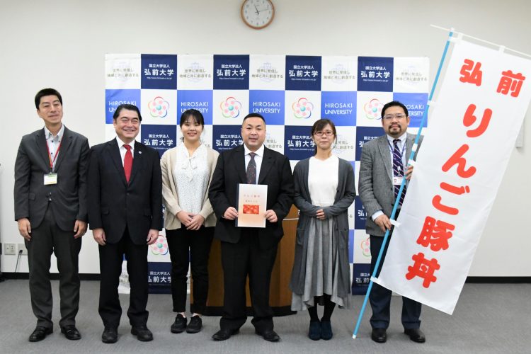 また、指導教員の石塚哉史教授(農学生命科学部)、弘前大学生活協同組合の坂巻秀樹様を含め、関係者で記念撮影をした後、出席関係者と報道関係者で『りんご豚丼』の試食会を行い、りんごと豚肉の組み合わせを味わっていただきました。