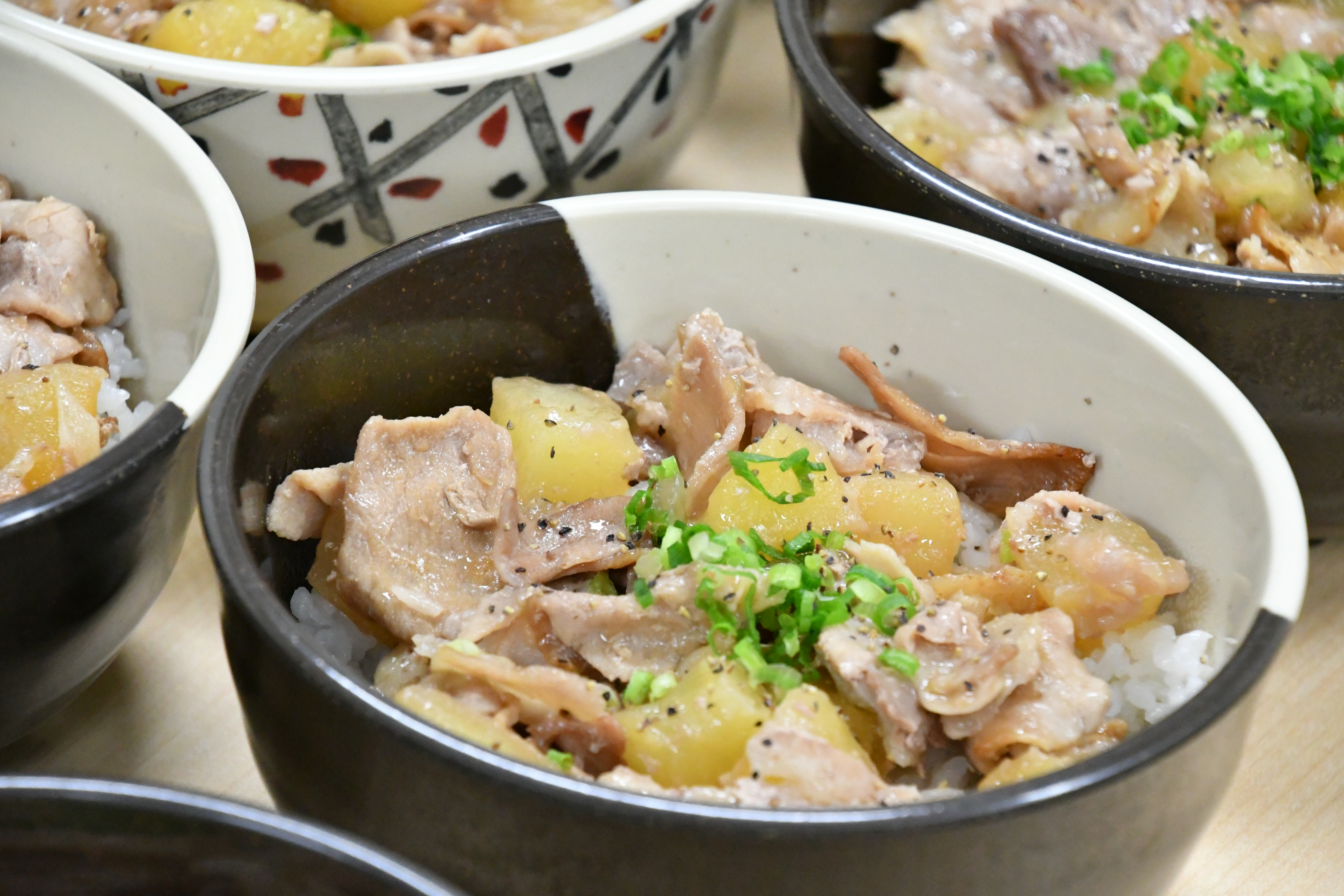 『りんご豚丼』は、弘前大学の地域特定プロジェクト志向専門人材育成プログラム「6次産業化マイスター育成プログラム」のインターンシップにおいて、弘前大学の学生2名(農学生命科学部4年 角田瑞季さん、川村ちこさん)が、冷凍りんごを用いた新メニューとして商品開発したものです。