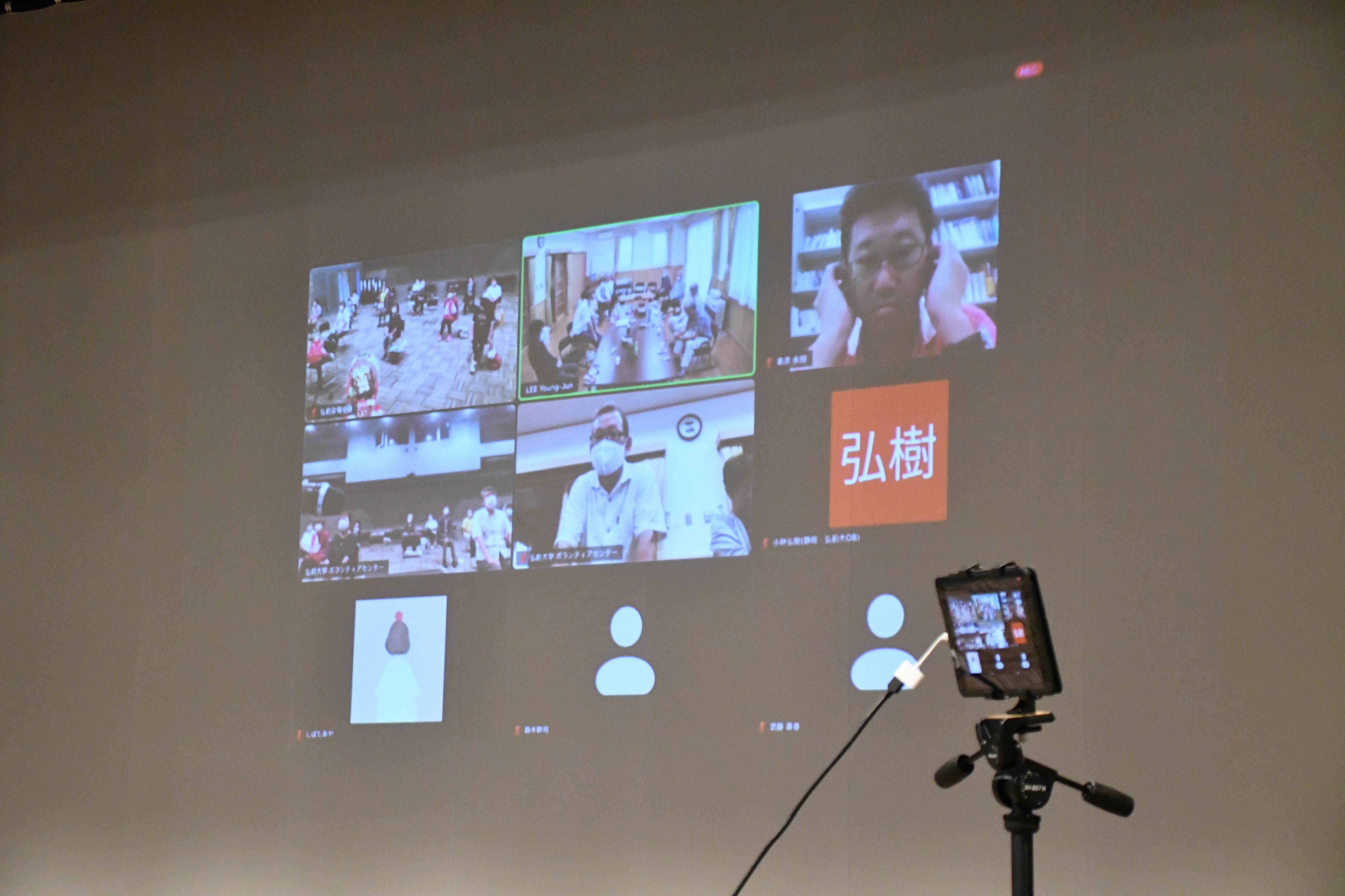 初めての試みとなるオンライン茶話会は,ZOOMのビデオ会議を利用し,野田村新町地区コミュニティーセンターの野田村会場と弘前市民文化交流館ホールの弘前市会場の二つのパブリックビューイング会場,自宅にいる学生等をつないで実施しました。