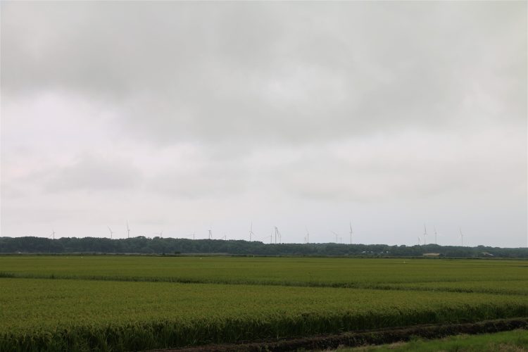 一行はその後、計38基の風車のうち、12基の風車が林立する「南サイト」へ移動し、実際に風車を見ながら、発電の仕組みや風車の特徴などについて説明を受けました。見学中にちょうど、効率よく風を受けられるようブレード(風車の羽の部分)の角度が変わるタイミングがあり、学生から「1日何回くらい角度が変わるのか」と質問が出ると、担当の方から「日により違い、コンピュータで都度制御している」旨説明がありました。また、畑の真ん中に風車が立っていることから、畑仕事をしている方にも親しみを持っていただきながら事業を実施していくことが大事であることが強調されていました。