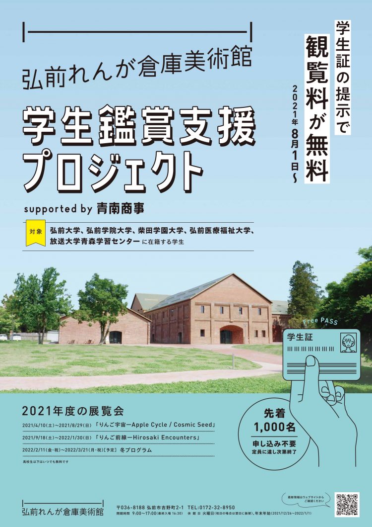 現在弘前市内5大学に在籍する学生(先着1,000名)の観覧料が無料になる「学生鑑賞支援プロジェクト」が実施されています。