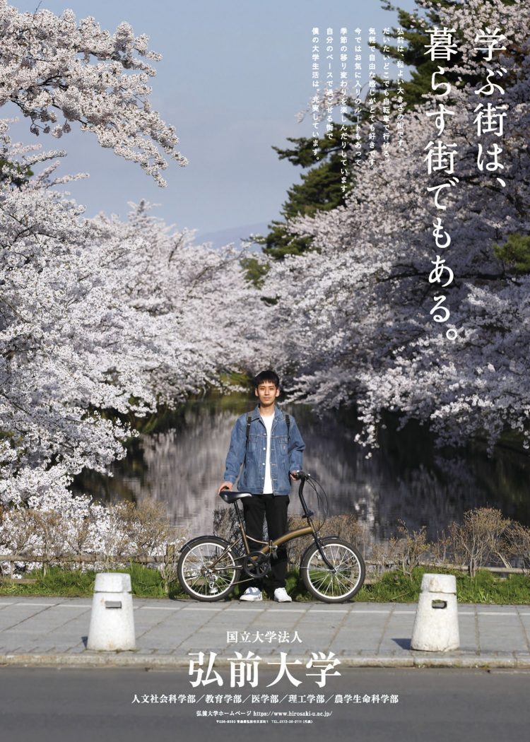 ポスター制作を担当したデザイン工房エスパス代表 木村 正幸 氏からは、「弘前大学のストロングポイントは何だろう、と考えた時に、学生が4年間学び・暮らすこの『弘前の地』こそがまさにそれだと思い、弘前に暮らしている学生の姿が風景に溶け込んでいるようなポスターを制作しました。弘前らしさを出しつつも、観光ポスターのようにならないよう意識しています。」と制作における意図やプロセスをお話いただきました。