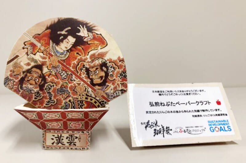 2022(令和4)年8月1日~8月7日の弘前ねぷたまつり期間中、弘前ねぷた300年祭を記念し、日本航空(JAL)の青森―羽田(東京)線の航空機入口付近にりんごやさくらの剪定枝を原料とした弘前の「扇ねぷた」のミニチュアペーパークラフトを展示します。