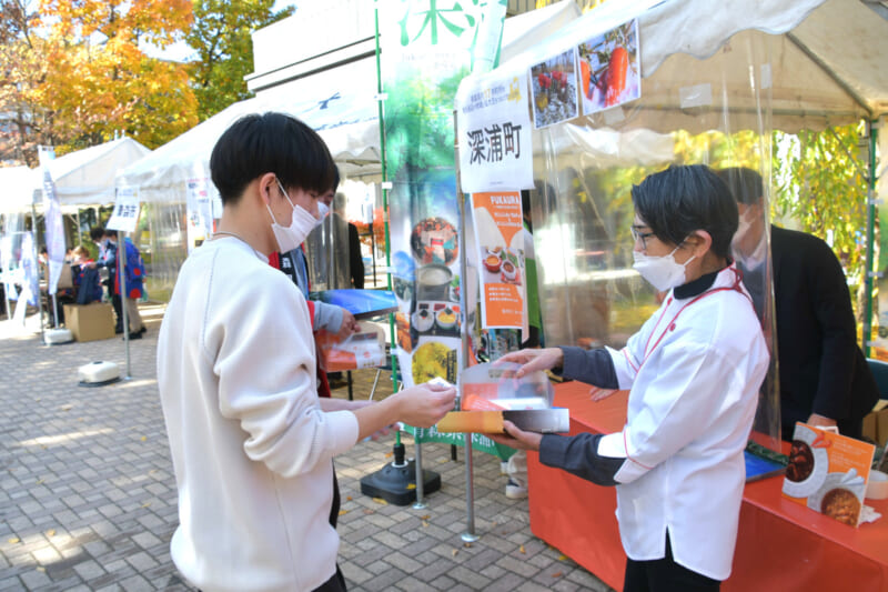 市町村職員も参加し、詰め合わせの提供、学生食堂でのメニュー提供が行われ、会場には多くの学生が訪れ大盛況となりました。