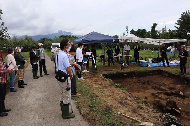 今年度の発掘調査の結果、大型竪穴建物跡のほかに土坑1基、遺物集中区1基、埋設土器1基が見つかりました。これらのうち、大型竪穴建物跡は、中央に大きな石囲炉を伴う焼失住居跡と分かりました。またこの建物跡からは土器や石器、玉や石鏃など多くの遺物が見つかりました。そして、土坑からは副葬品とみられる壺、埋設土器の覆土上部からは小型土偶が見つかりました。さらに、土壌をフルイがけしたところ、100粒以上になる炭化米が見つかりました。またイネ圧痕のある土器も複数見つかりました。これらのことから、比較的安定したイネ栽培が行われていたことが分かります。そのほか「類遠賀川系」と呼ばれる西の弥生土器の影響を受けた土器や、北海道産の石材で製作された石斧がみつかり、南北双方との交流が盛んだったことが分かります。