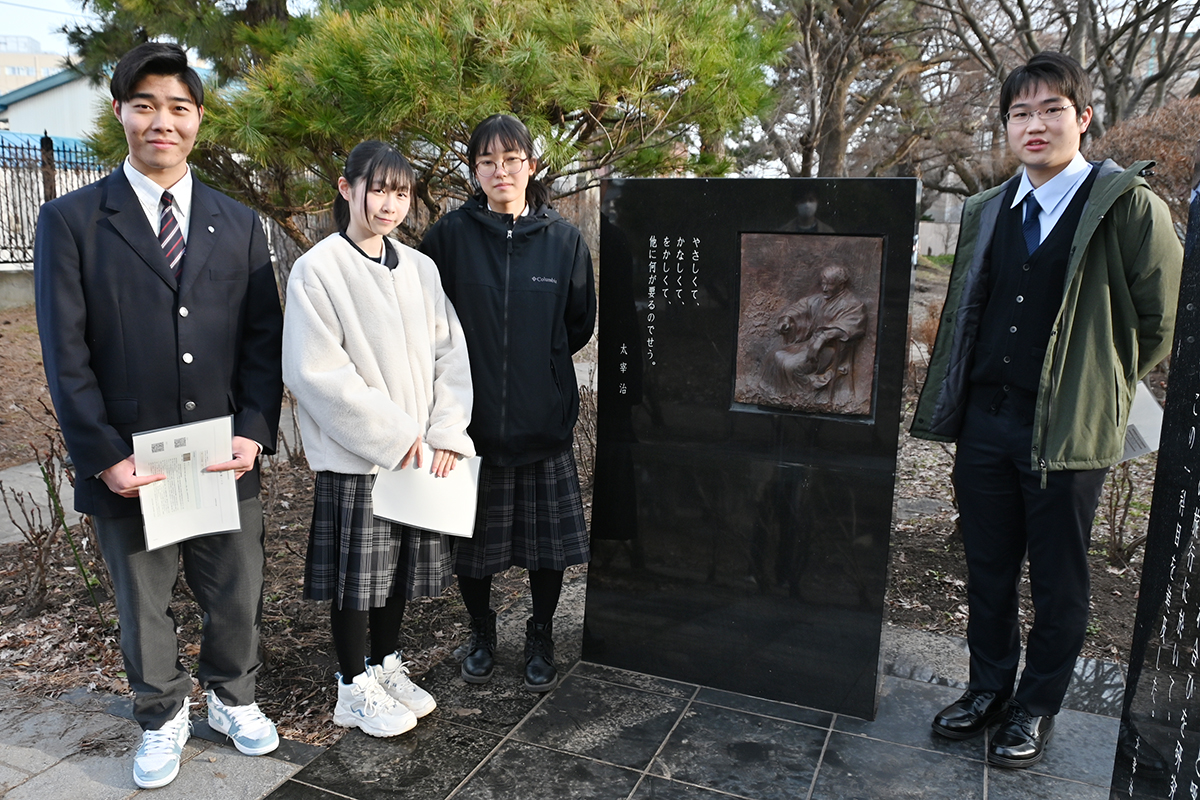 第2回コンテストは、昨年9月から10月にかけて、個人・グループの2部門で小論文を募集し、全国の高校生の皆さまから516件(受賞数は21件(個人部門13件、グループ部門8件)、うち青森県内は6件)の応募作品が寄せられました。最優秀賞である津軽賞に輝いた長岡高等学校(新潟県)2年の市川智史さん(個人部門)と、五所川原農林高等学校(青森県)2年の煤田湊さん、髙橋愛果さん、大澤小梅さん(グループ部門)の2組を弘前大学に招待し、表彰式を行いました。表彰式の後には、キャンパスツアーで大学構内を巡り、大学施設や太宰治の文学碑などを見学しました。