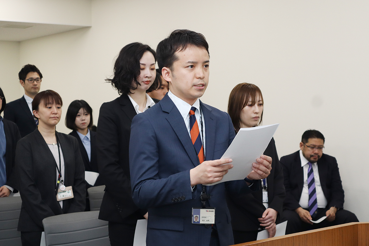 福田学長からは「弘前大学に力を貸していただけることに心から感謝するとともに、連携推進員活動の経験を糧に自分自身を成長させてほしい」旨の挨拶がありました。連携推進員を代表して青森銀行の木村 太亮氏からは「地域を取り巻く様々な課題に対する解決能力を学術的、実務的の双方の観点から学ぶとともに、地域の発展のために弘前大学と自治体及び金融機関等との連携をより一層深めるよう能動的に取り組みたい」旨の挨拶がありました。
